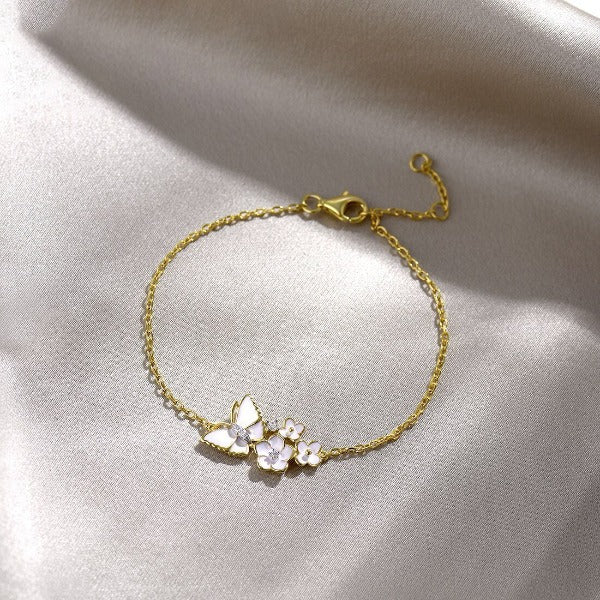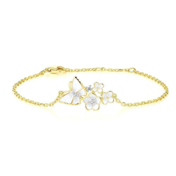 This butterfly bracelet, crafted in fine silver, is gold plated, highlighting its white enamel details. The orchids symbolise passion, sensuality, and splendour, while the butterfly represents transformation and freedom. This combination of virtue and elegance delicately wraps around your wrist, enhancing your most beautiful outfits.