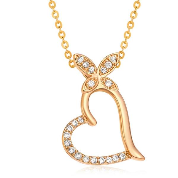 This beautiful necklace features a butterfly and a heart together. Both are adorned with cubic zirconia crystals that give them sparkle and splendour. The gold colour and delicate curves make this piece a charming accessory that embodies femininity.