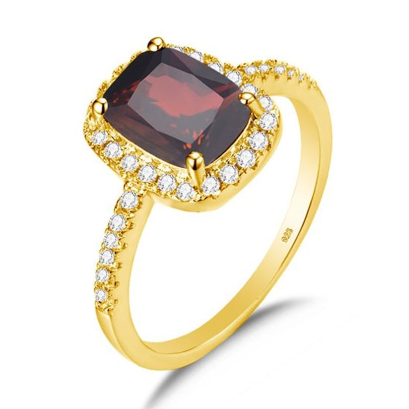 This gold ring features a garnet stone, a symbol of love and friendship, making it a perfect gift for someone special. The silver band is thin and elegant, and the ring itself is simple yet sophisticated. It's the ideal way to add a touch of distinction to any outfit.
