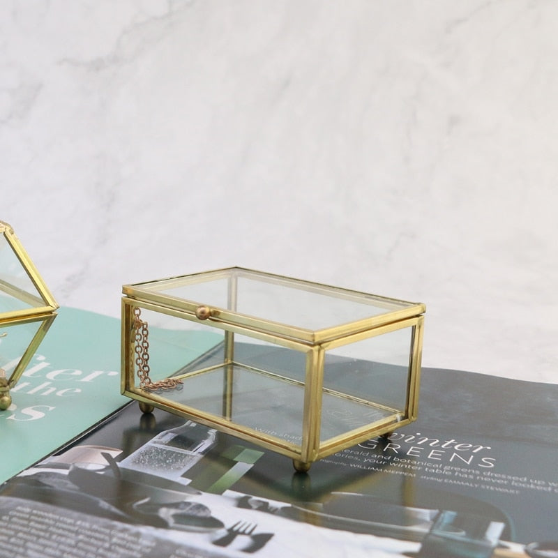 Keep your wonders safe in this Gold Glass Jewellery Box. Expertly crafted from high-quality metal and glass, this box combines durability with elegant aesthetics. The transparent design highlights your precious items, while the gold edges add a touch of glamour. Available in various shapes such as triangle, prism, and rectangle, it’s not only functional but also serves as a stylish decorative piece. The raised feet provide extra stability, allowing the box to shine on any surface.