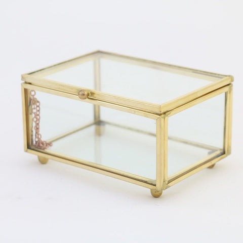 Store your treasures beautifully in this gold and glass jewellery box made of metal, featuring a transparent design with gold edges and support feet.