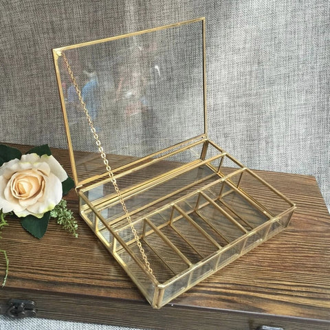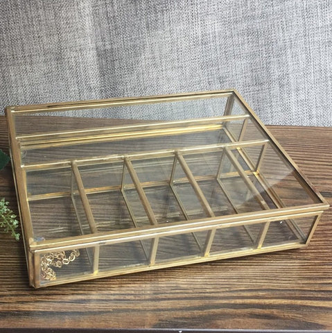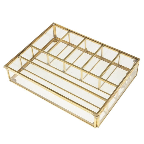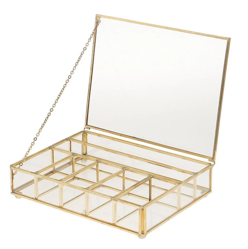 This Golden Jewellery Box is a large case featuring various dedicated compartments and sections for neatly organising and storing jewellery and accessories. Crafted from gold-toned brass and glass, it boasts a luxurious and elegant appearance. Gold brass is a durable material that resists corrosion and is easy to clean, while the glass adds transparency and shine. The lid is secured with a brass chain, adding a touch of sophistication and safety. The chain ensures the lid stays in place, preventing accidental opening and protecting the jewellery inside.