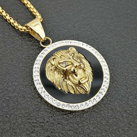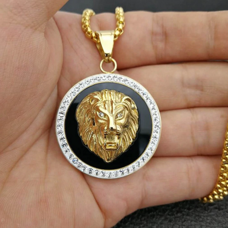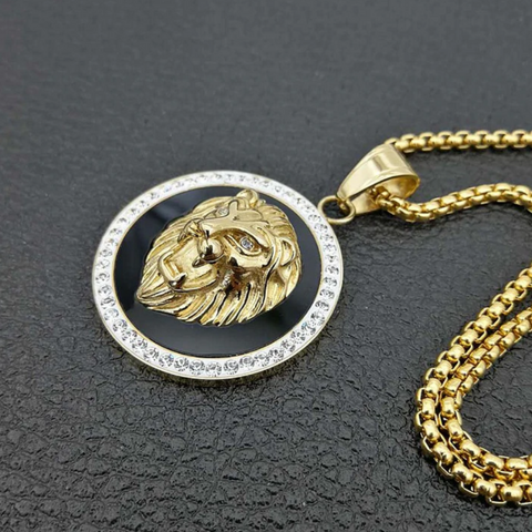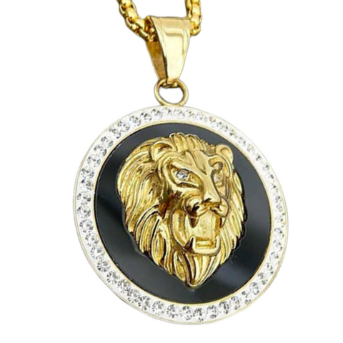 Stunning necklace with golden lion head pendant. Let the strength of the lion accompany you as you wear this necklace adorned with a ring of diamonds and the animal's golden mane. The chain is also made of steel with a gold finish.