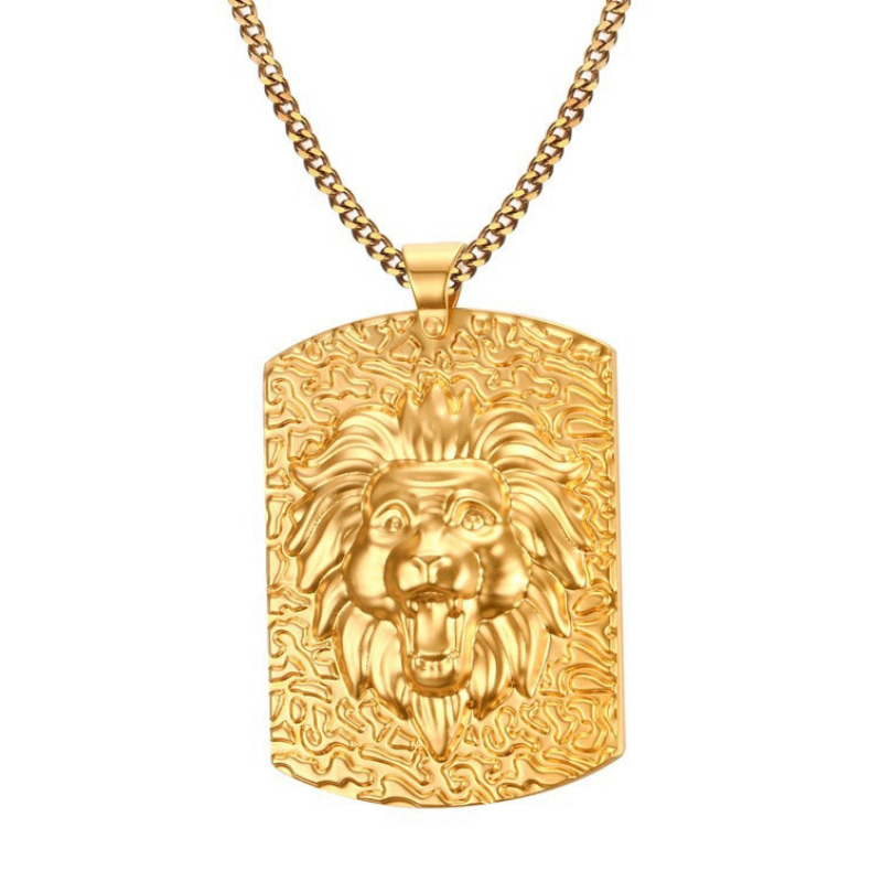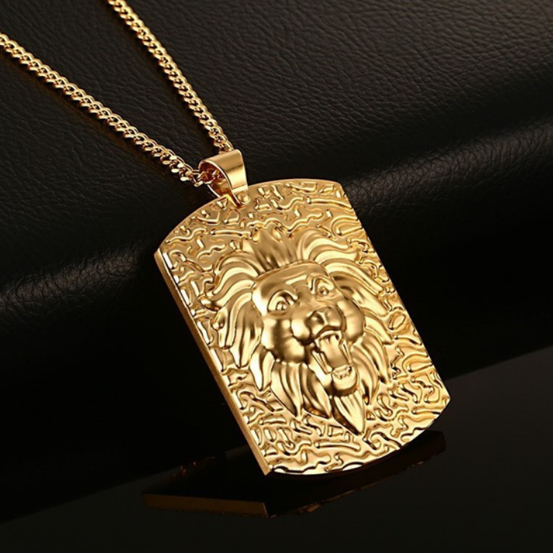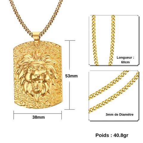 Impressive gold pendant with a centralized lion's head. This necklace is highly valued for its quality and ease of use, adding style and elegance to all lion enthusiasts.