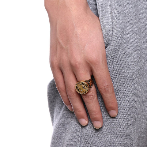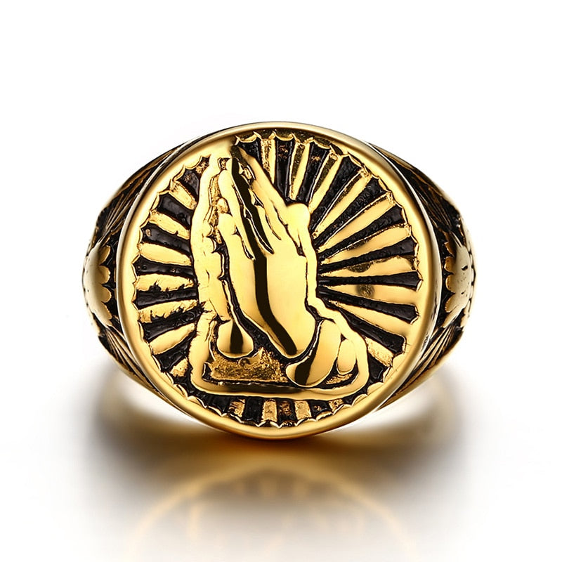Let yourself be enchanted by this high-quality religious ring, made from golden zinc alloy with a polished finish. Engraved on the front of the signet ring are praying hands, and on the sides, hearts to remind you of all the love Jesus has for you. All the protection and love of Christ on your finger.