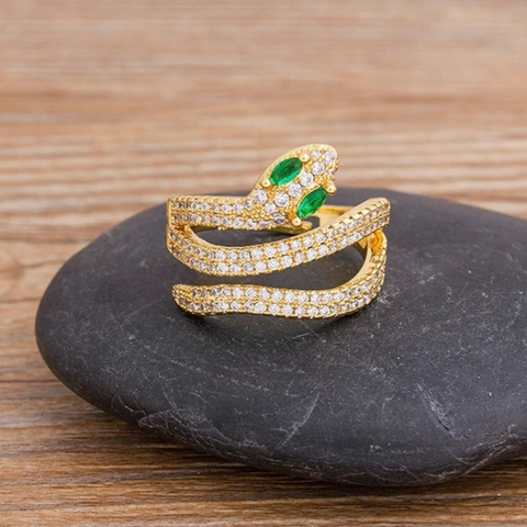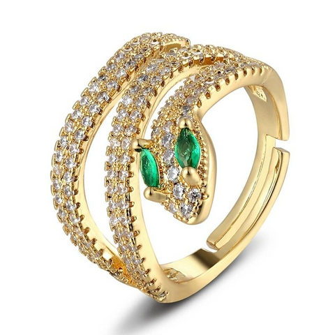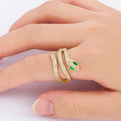 This gold and diamond snake ring is pure elegance. Its golden color evokes a material associated with ultimate luxury. The body of the snake that coils around your finger is adorned with diamonds. The green diamonds in the snake's head are another enchanting highlight.