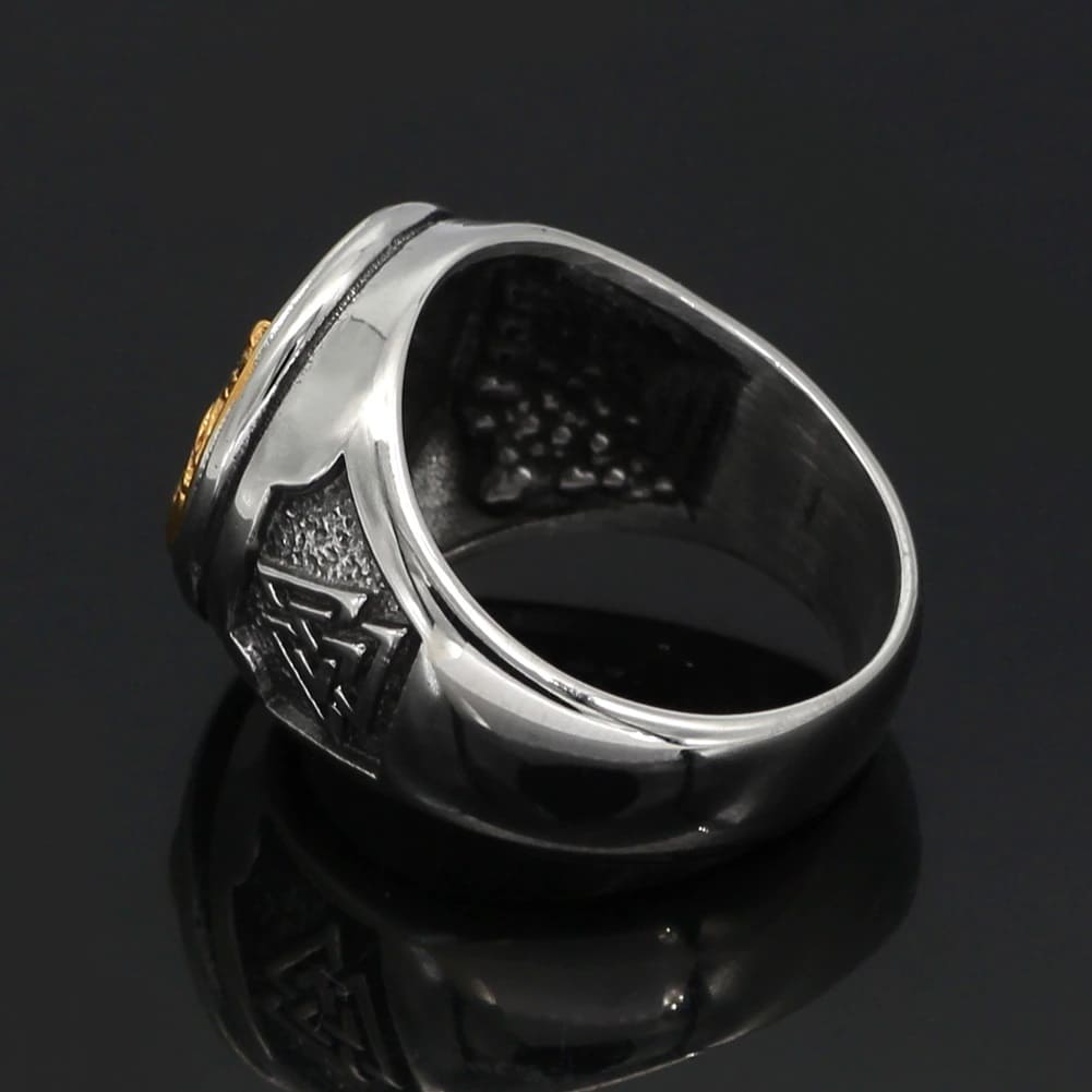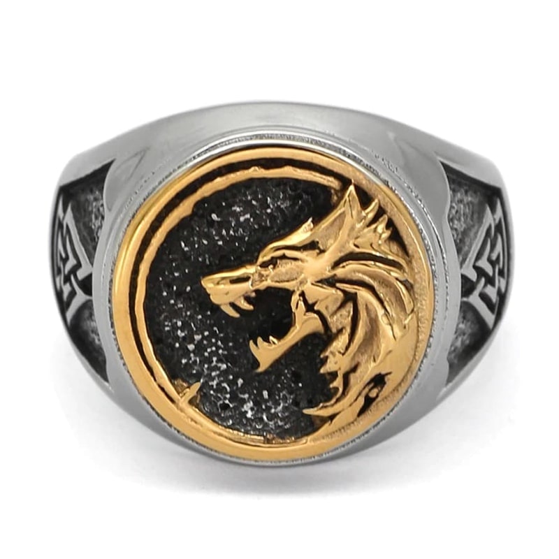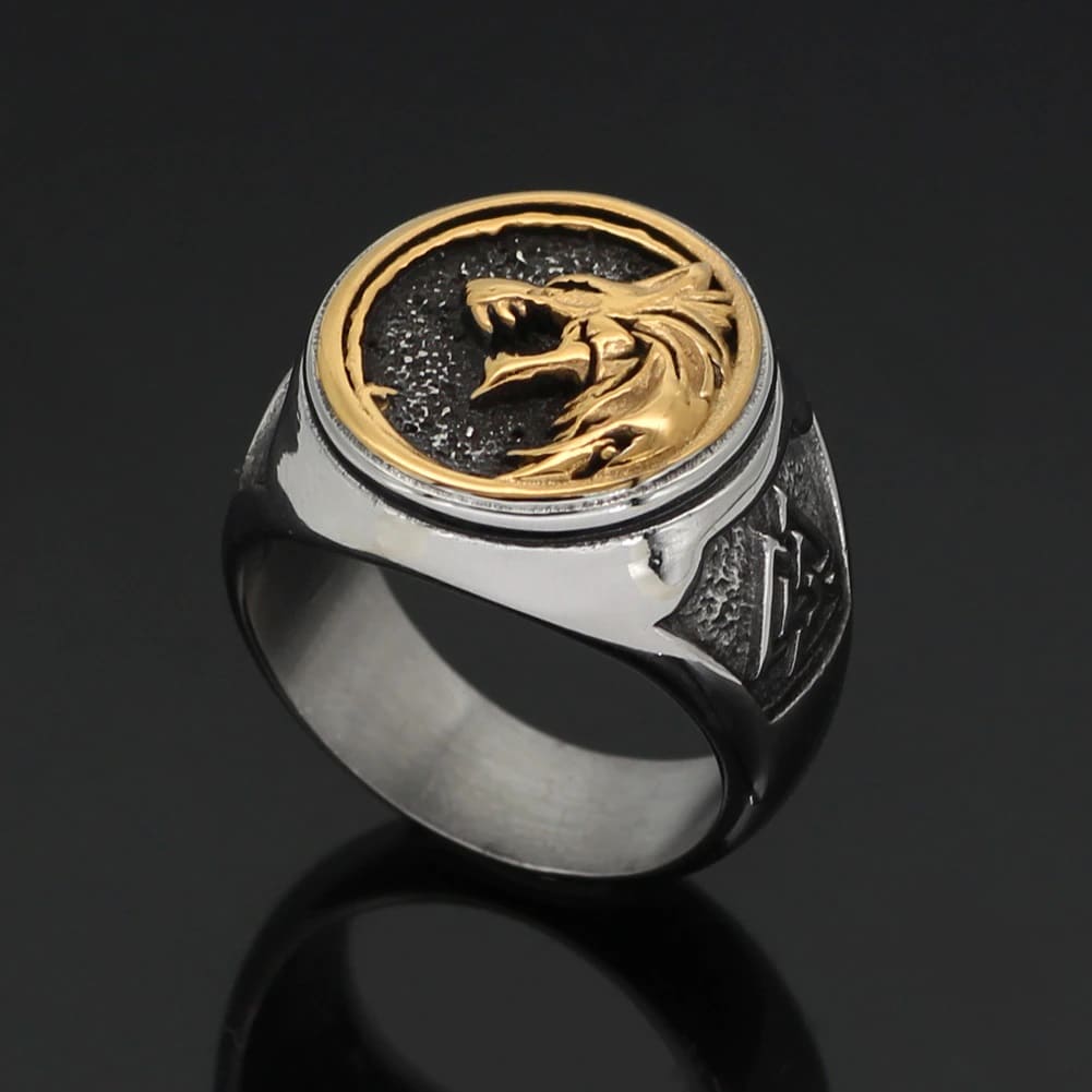 Embrace the ferocity of the wolf with this ring adorned with a golden Viking wolf.