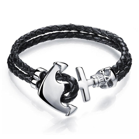 This nautical bracelet is made of genuine leather and is adorned with a maritime anchor, a steel skull, and crossed bones.