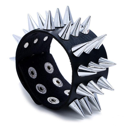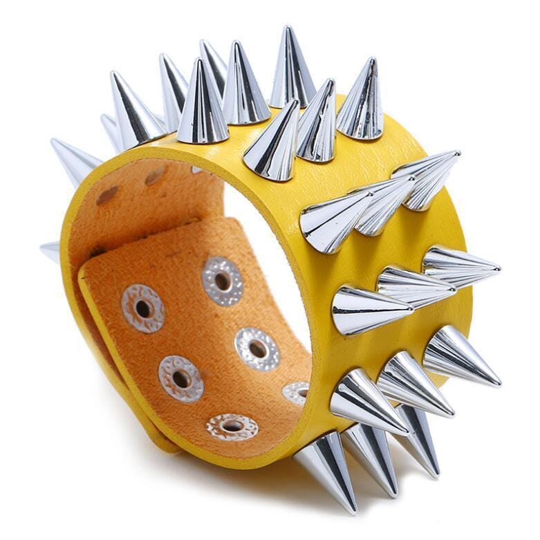 The protruding steel spikes create an extremely impressive and intimidating strength bracelet! This rock-style gothic bracelet is available in three different colours: grey, yellow, orange, and black. Specially created for punk and rock musicians!