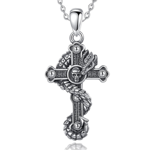 The meaning of this snake and cross pendant necklace is remarkable. It represents the duality of the soul: evil through the snake and skull, and good through the cross of Christ.