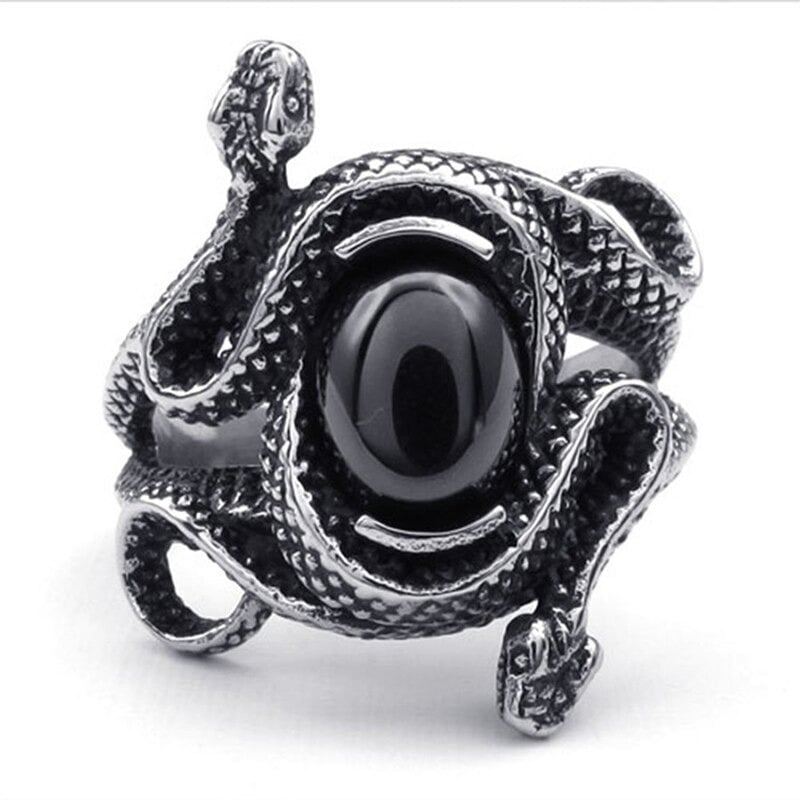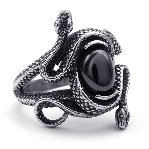 This Gothic snake ring is a truly unique model. It stands up to any other design in the snake-themed ring collection. In this unisex ring, two snakes intertwine around a black eye, making it extremely captivating.
