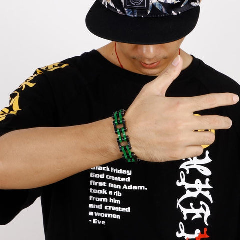 This stainless steel motorcycle chain bracelet in green and black is a favourite accessory among bikers. It pairs well with any style of clothing and allows you to show off your passion for two wheels.