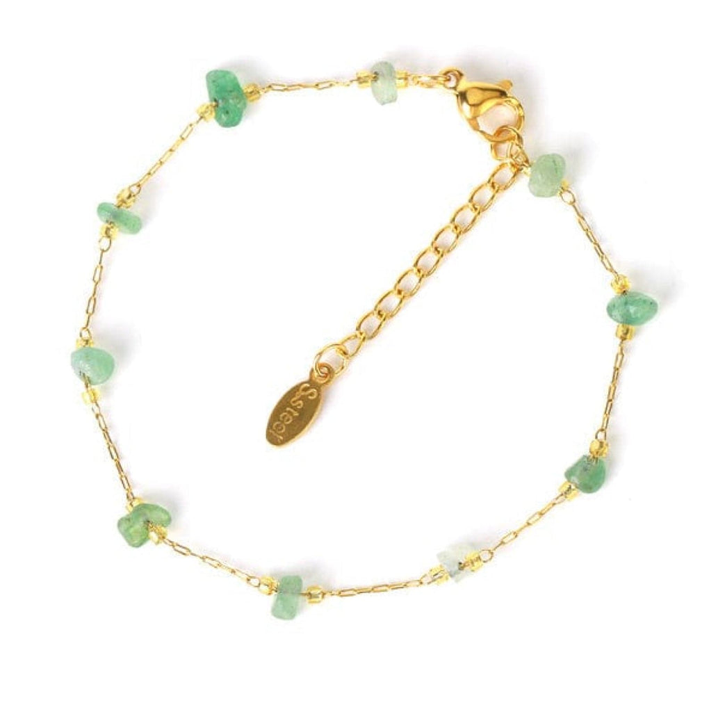 This gold bracelet is made from stainless steel and aventurine, giving it a unique look. The green colour is striking and the metal is durable, making it a perfect accessory for any outfit.