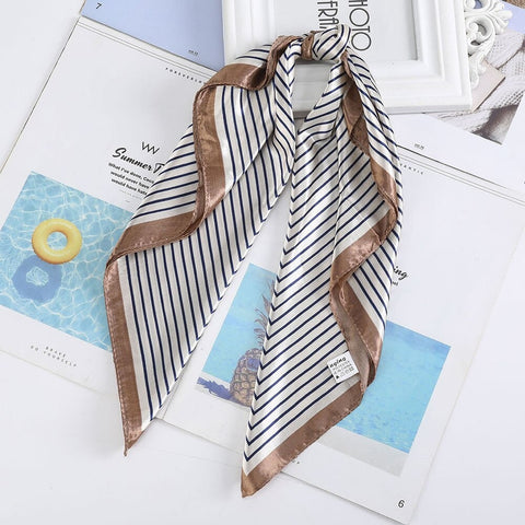 A simple design hair scarf with black stripes outlined by a light brown border. An elegant and timeless accessory that adds a special touch to the look, whether worn in the hair or around the neck.