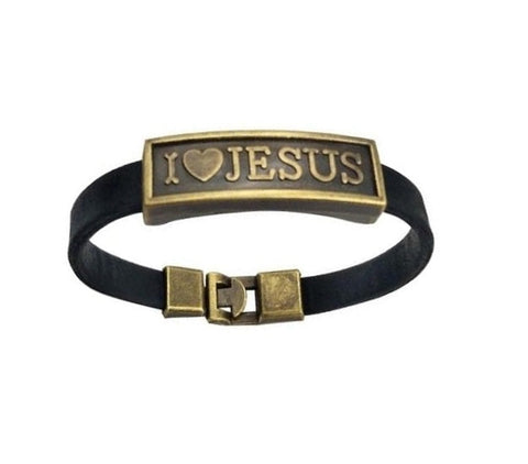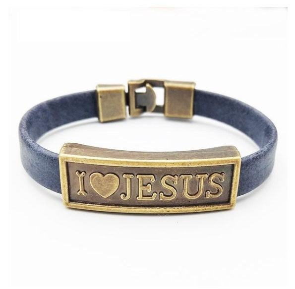Let yourself be seduced by this high-quality bracelet made of leather and stainless steel, with a gold bath and a vintage-style finish. The inscription "I Love Jesus" is engraved on a stainless steel plate. The bracelet has a diameter of 22 cm and closes with an anchor-shaped clasp. Carry all the love and protection of Christ on your wrist.