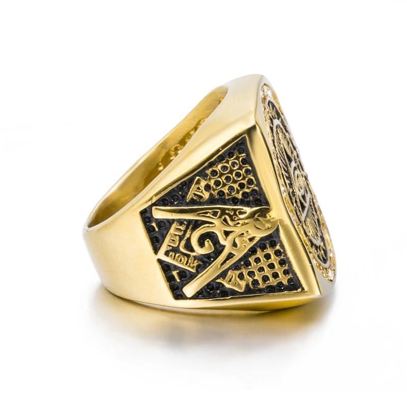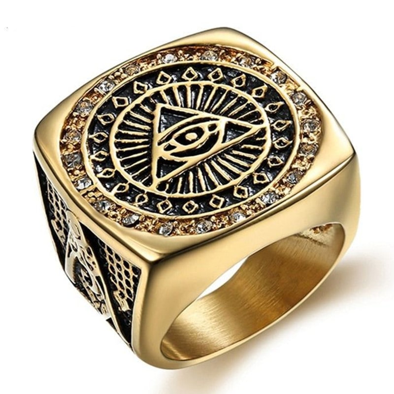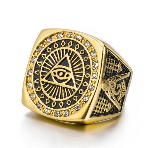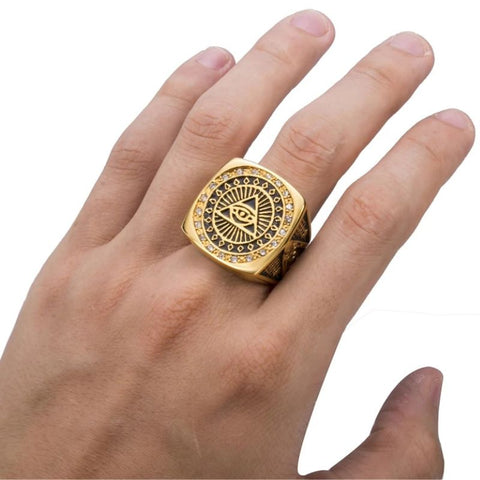 This signet ring features a square surface design and the symbol of the Order of the Illuminati. The engravings have been done with great precision to perfectly represent the pyramid and the Eye of the Illuminati. The ring is made of stainless steel with a gold finish, maintaining its shine for a long time without rusting or causing allergies.