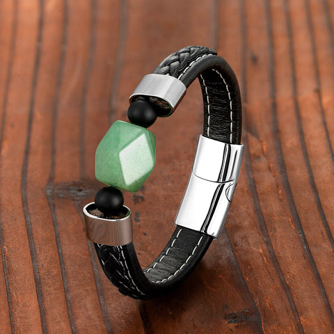 This jade bracelet is made of leather and stainless steel, with a beautiful, shiny jade stone on the surface. It's a durable bracelet that perfectly complements both casual and professional looks.