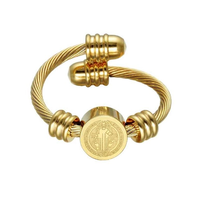 Allow yourself to be enchanted by this stunning high-quality religious ring, crafted in golden stainless steel. The ring size is adjustable, elegantly fitting any finger. It features a finely engraved image of Christ. An elegant piece with timeless elegance - all the love and protection of Christ on your finger.