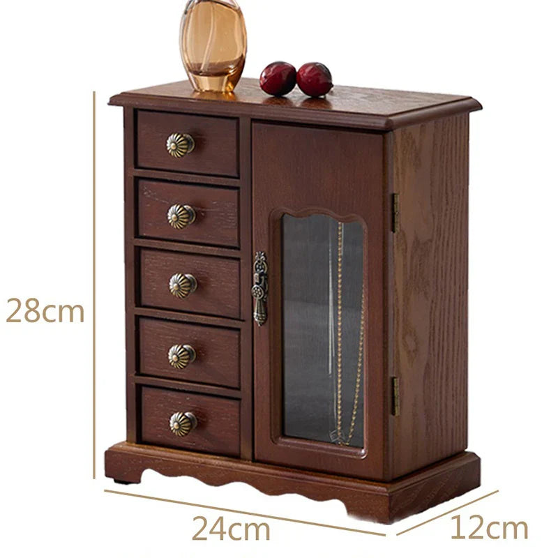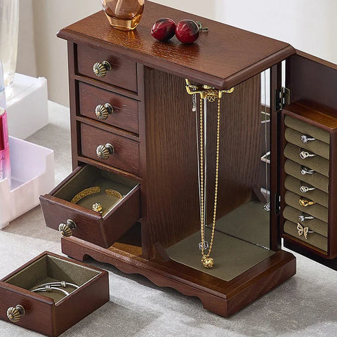 Valuable and antique jewellery pieces deserve proper storage to preserve their quality and value. This vintage wooden jewellery box provides the ideal environment, shielding your treasures from air, light, and moisture. Its charming and unique aesthetic creates a nostalgic retro vibe that pairs beautifully with various interior styles. You can place it in your bedroom or walk-in wardrobe. Featuring individual compartments, this accessory offers dedicated spaces for your collections, allowing you to store rings, necklaces, bracelets, and earrings separately and keep them easily accessible. The wood used in crafting this vintage wooden jewellery box is known for its durability and strength, offering a natural and sturdy barrier to maintain the beauty and integrity of your precious pieces.