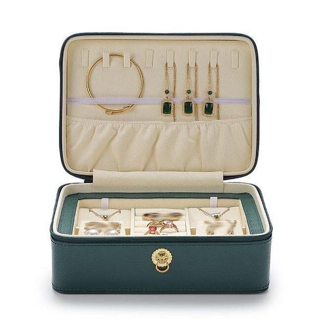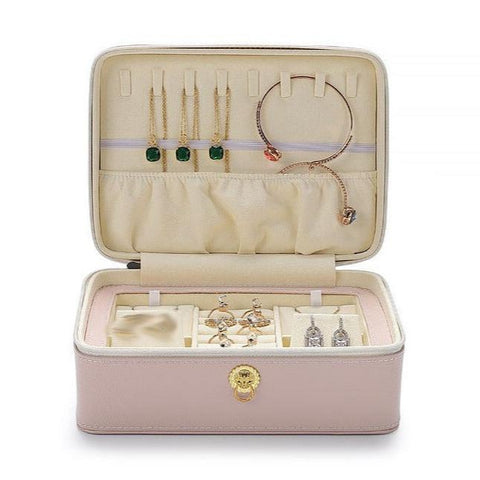 Choose this leather jewellery box with a gold-toned, decorative finish. Elastic pocket, hooks and zipper to keep your jewellery organised.
