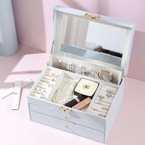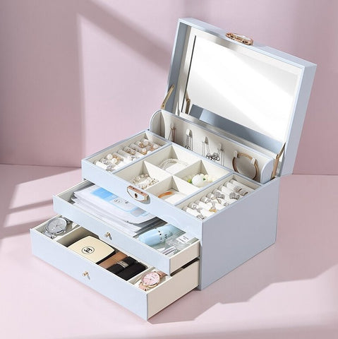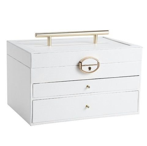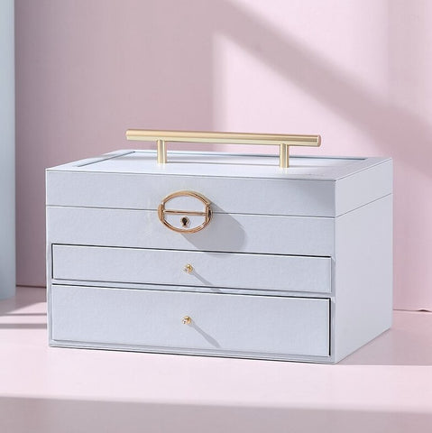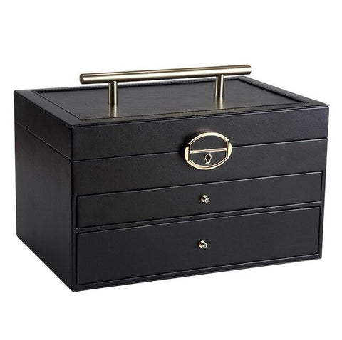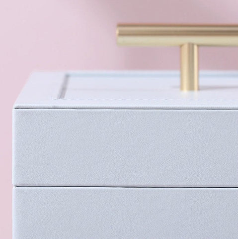 Choose this Jewellery Presentation Case, which not only looks stunning but is also highly practical with its gold-toned brass carry handle. Even if you don’t have a large jewellery collection yet, the box offers plenty of space thanks to its multiple compartments. Use the removable and extendable drawers to store your cosmetics, bracelets, or jewellery pieces. It includes a dedicated watch compartment, which comes with a complimentary cushion. Necklaces are well-protected and won’t get tangled. Make use of the side mirror to adjust and perfect your accessories in place.