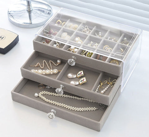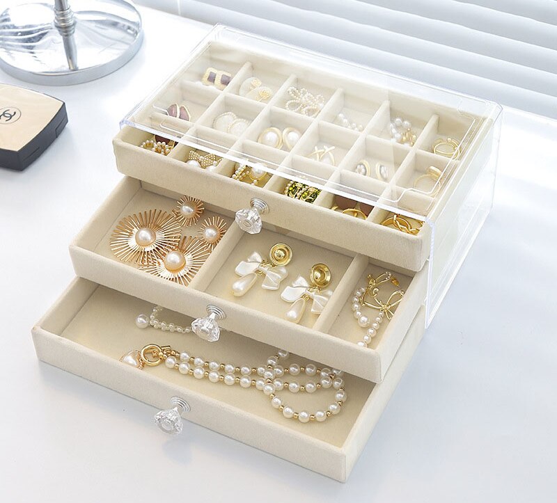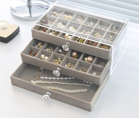Whether you have a small collection or a wide variety of earrings, this Keepsake for Earrings is the perfect accessory to keep your jewellery tidy and within easy reach. Discover an earring jewellery box specially designed for storing and organising your favourite earrings. Measuring 13.5 x 23.5 x 10.5 cm, this jewellery box is crafted from premium velvet and offers soft, elegant protection for your jewellery. The transparent lid allows you to view your collection at a glance, while the pull-out trays and drawers with stylish handles provide dedicated spaces for storing and displaying your earrings and other fashion accessories.