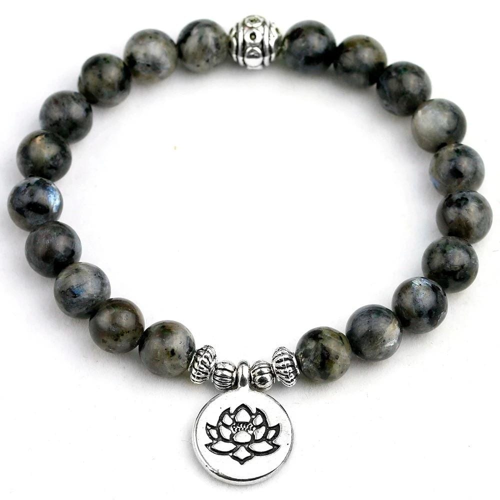 This labradorite stone bracelet with a lotus flower is made from beautiful and elegant natural stone. It can help you relax and find inner peace.