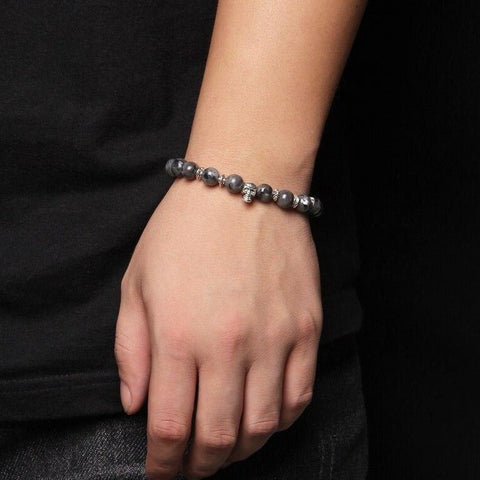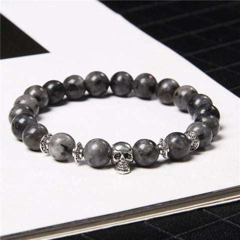 Pearl bracelet with labradorite and a skull in the centre. This gothic-style accessory is a great addition to your collection, ideal for both men and women. Labradorite symbolises diversity, adaptability, ingenuity, and wisdom.