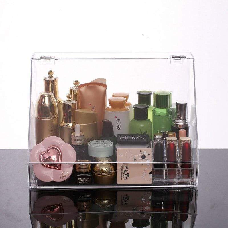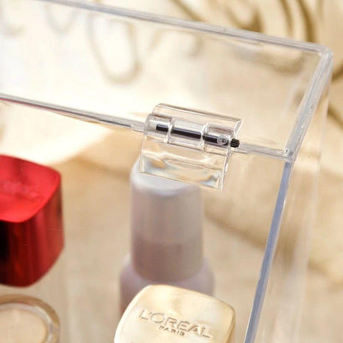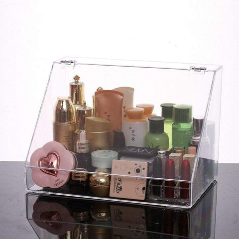 Large acrylic makeup organizer box with a lid that protects from moisture. Allows you to safely store your entire cosmetics collection.