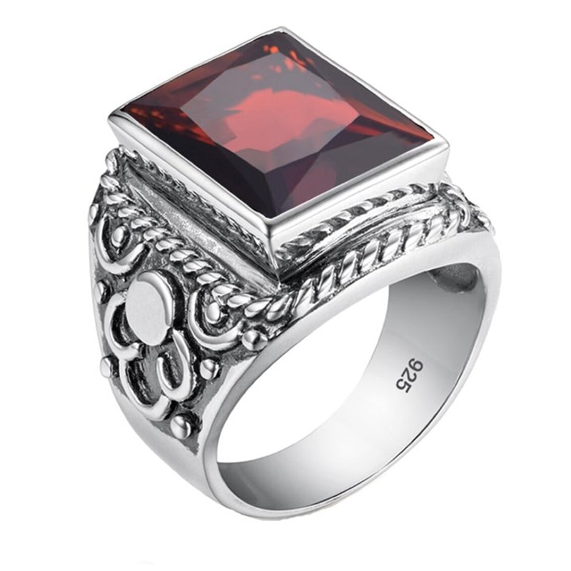 This is our large ring, made with a unique garnet stone. The 925 silver setting has been polished to a bright finish, and the garnet stone adds sophistication and elegance. The ring is available in a large size.