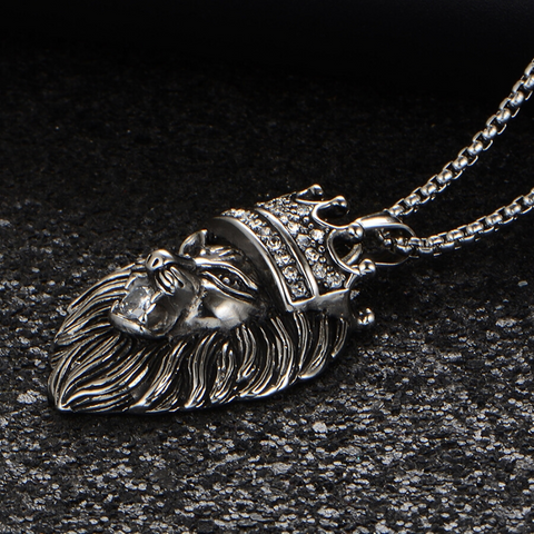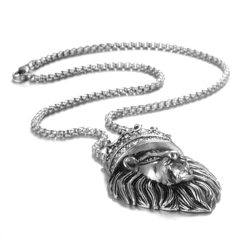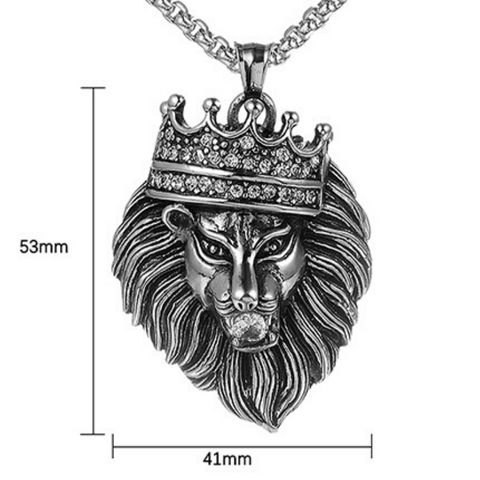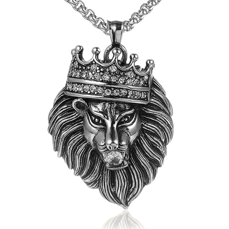 Magnificent Large lion pendant with its dense mane accompanied by a beautiful crown - a piece of jewellery with a strong identity of what the lion represents. Lion necklace in silver steel with small white diamonds.