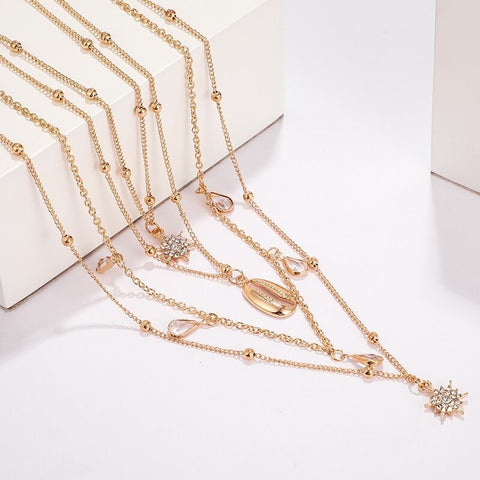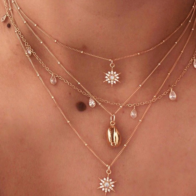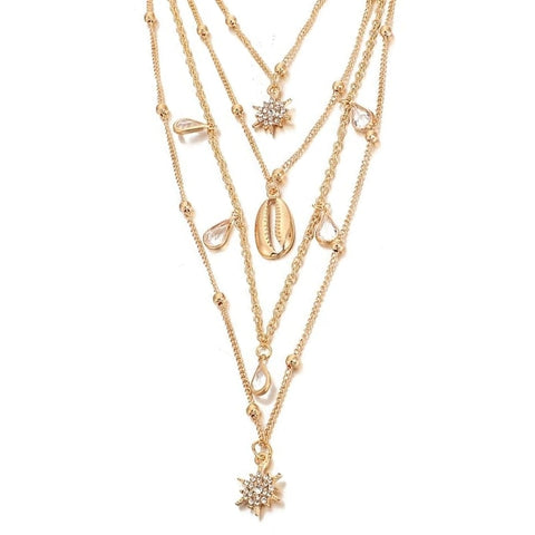 If you want to opt for a feminine look, this large necklace with a shell is perfect to highlight your neckline. With a water drop-shaped pendant, a sun pendant and a gold shell-shaped pendant, this set of necklaces is a true fashion accessory for your summer holidays.
