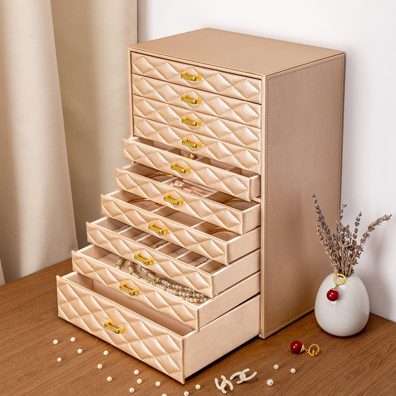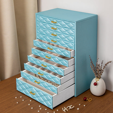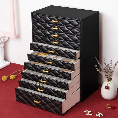 The stylish Large XXL Jewellery Box offer an elegant solution for storing your precious treasures securely and in perfect order. Each box features multiple pull-out drawers lined with soft padding to protect your jewellery from scratches. The modern embossed design gives these boxes a luxurious look, making them an attractive addition to any dresser or vanity.