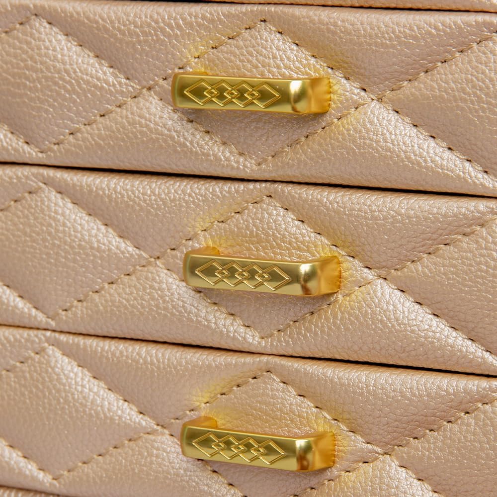 These Large XXL Jewellery Boxes combine functionality with contemporary design. Available in a range of colours – from soft beige to elegant black – they offer a versatile aesthetic that complements any interior. The uniquely padded texture on each drawer adds visual depth while also providing a better grip for opening and closing. Golden handles and the foldable drawer structure ensure easy and convenient handling, giving you quick and effortless access to your jewellery at all times.
