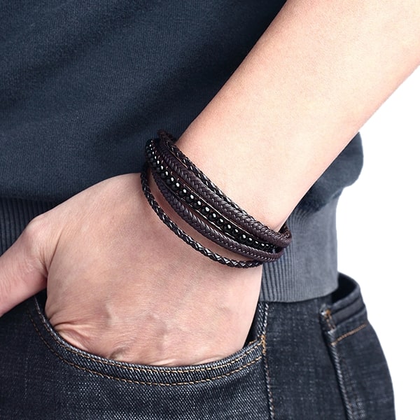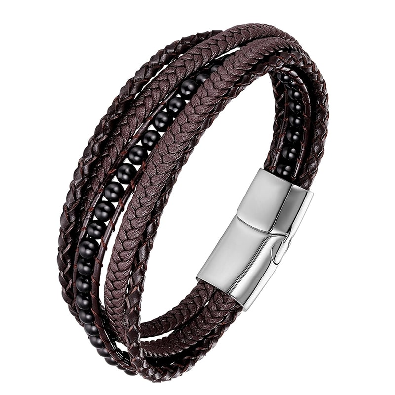 Discover the stylish men's leather bracelet with black beads.