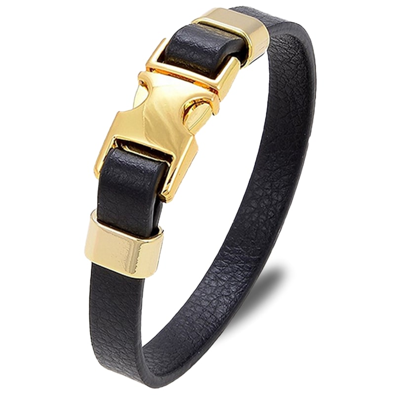 The men's leather bracelet with a gold buckle was created for men who appreciate practical clips and modern design, featuring a unique fastener similar to that of a backpack strap. The black leather matches perfectly with the metallic gold tone, making this fashion accessory a touch of luxury in the look of whoever wears it. Our men's leather bracelet with a gold buckle is an easy addition to any jewellery collection and a unique piece in its own right, whether worn daily or on special occasions.