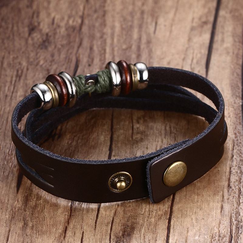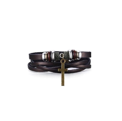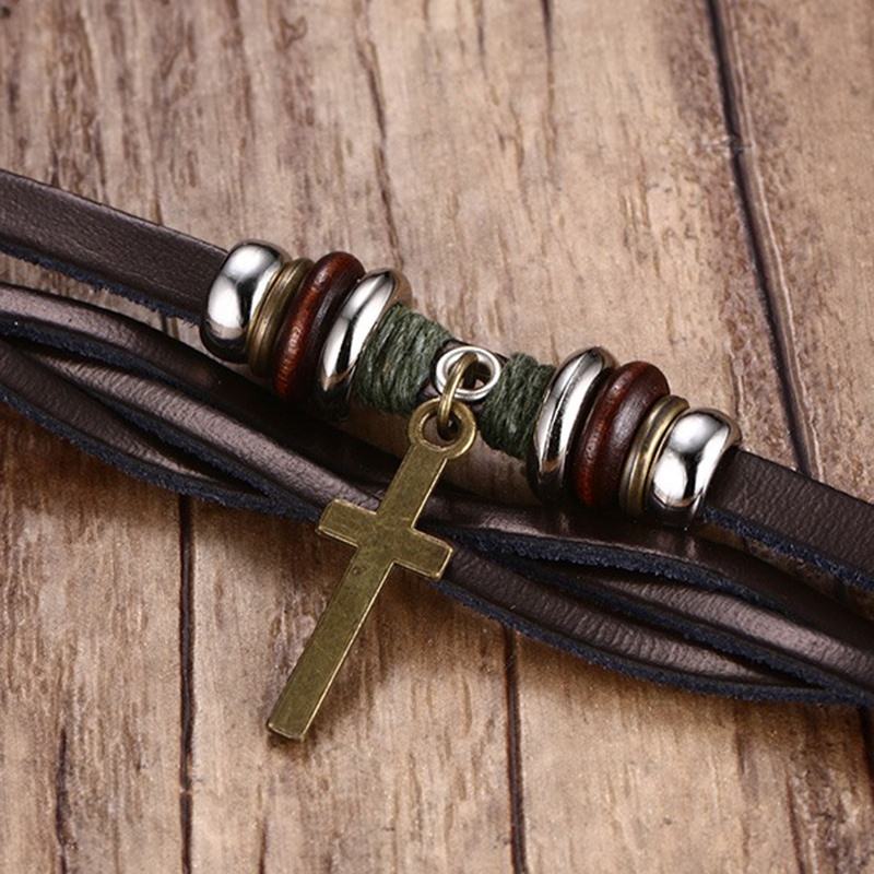 Men's leather bracelet with cross, with a length of 21.4 cm, adjustable thanks to the double clasp (suitable for all wrist sizes). Leather bracelet adorned with manually applied wooden and brass pieces. The focal point of this men's bracelet is a golden Christian cross made of stainless steel, the most important symbol of Christianity. Carry all the love and protection of Christ on your wrist.