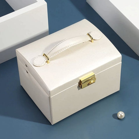 This leather jewellery box features multiple storage compartments. Comes with a handy makeup mirror and a carry handle.