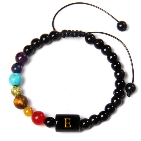 Beautiful bracelet with the letter E. The seven chakras are aligned with the colours of the rainbow, and each one is known to possess unique healing properties.