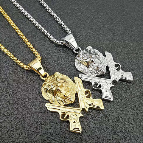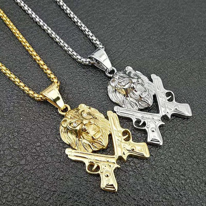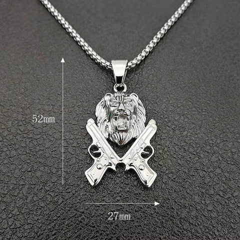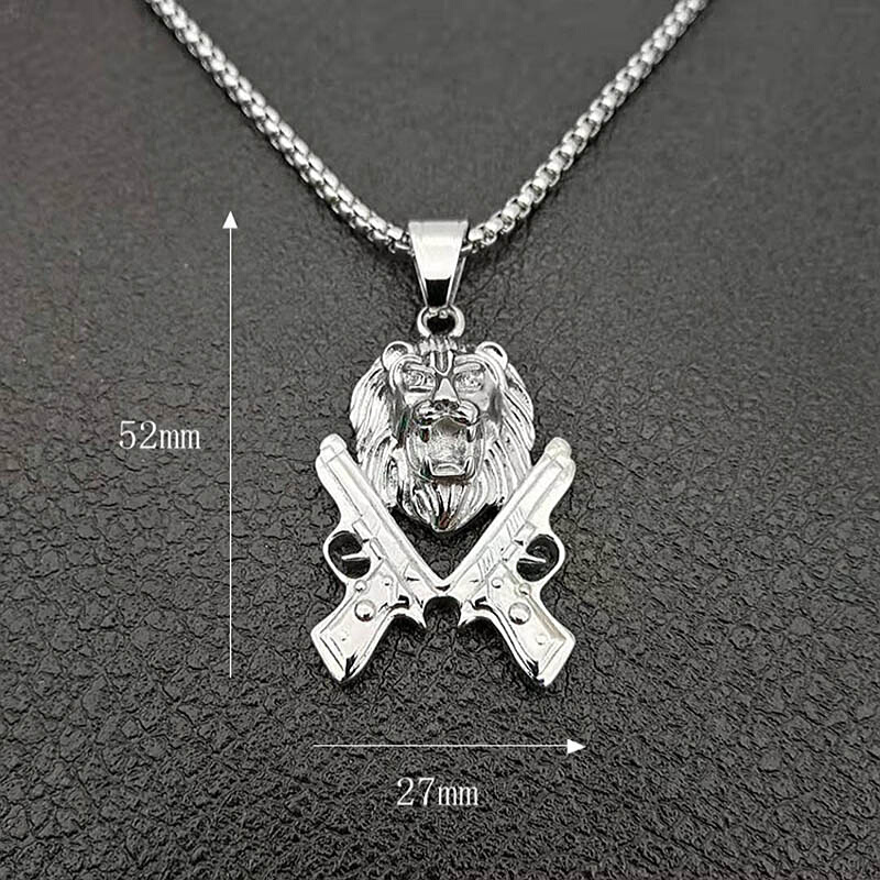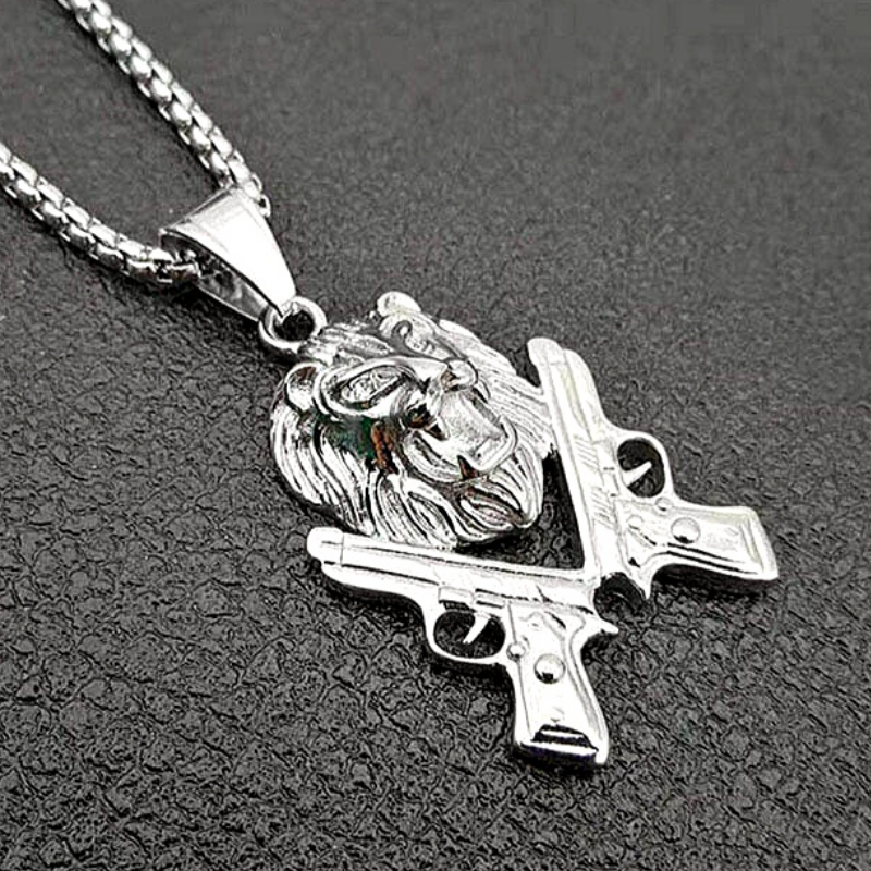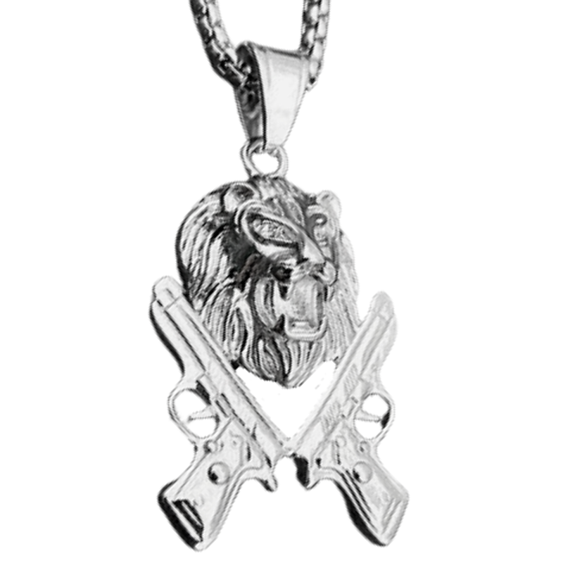 The lion is often associated with violence in films. A beautiful silver pendant in the shape of a lion's head, with two crossed weapons, forms a wild necklace for men.
