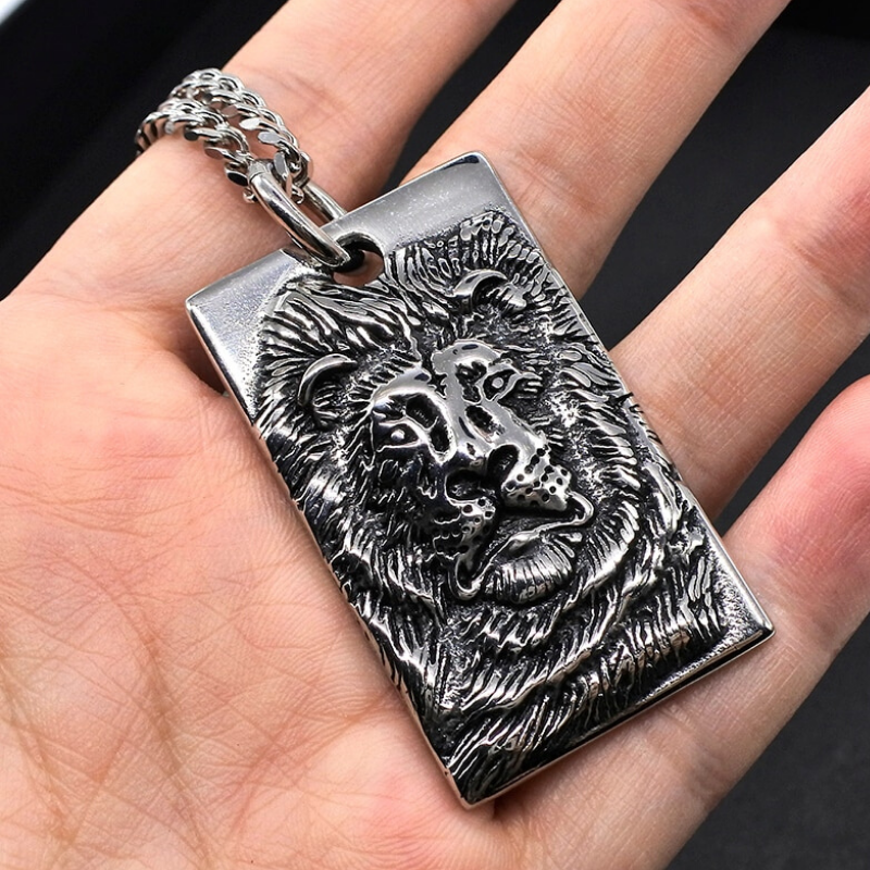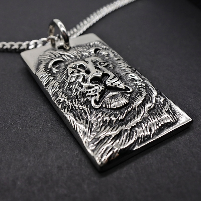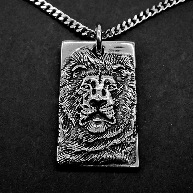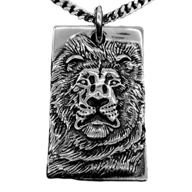 Impressive Lion-Man portrait pendant, with a feline face depicted on a steel plate. The lion accompanies you in your quest for supreme power. Men's necklace with an elegant link chain.