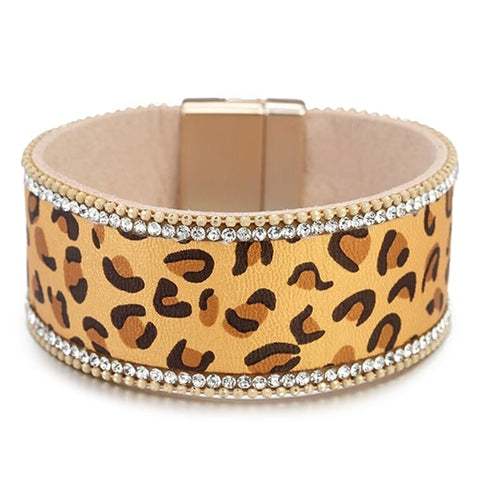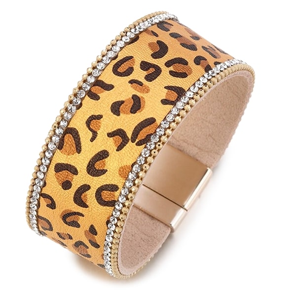 A luxurious women's leather bracelet, where the authenticity of the leopard skin look is combined with the sparkling shine of rhinestones to highlight your femininity — a fashion accessory with everything you need to seduce glamour lovers. This piece of jewellery is an elegant and practical complement, thanks to its stainless steel clasp. Whether to complement a daily look or to give a special touch to a gala outfit, luxurious women's leather bracelets are essential pieces that enhance the feminine style and enrich any jewellery collection.