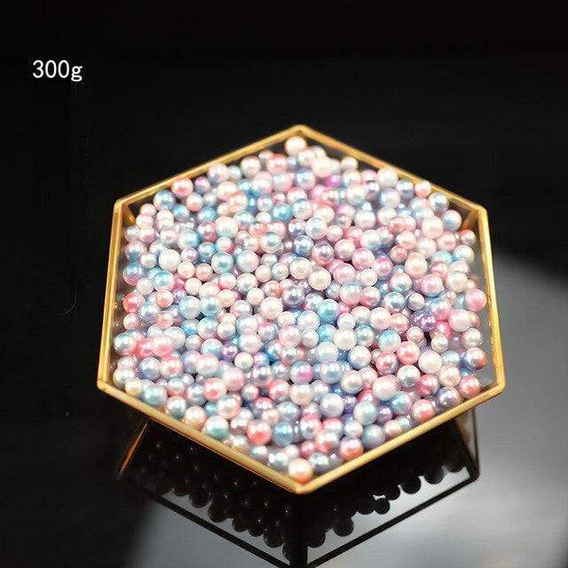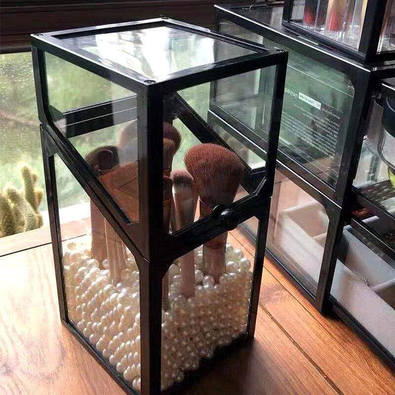 Makeup brush storage box, with white and coloured pearls inside that keep the brushes upright.