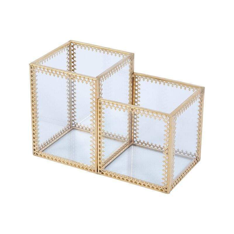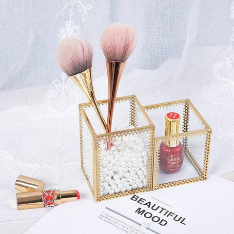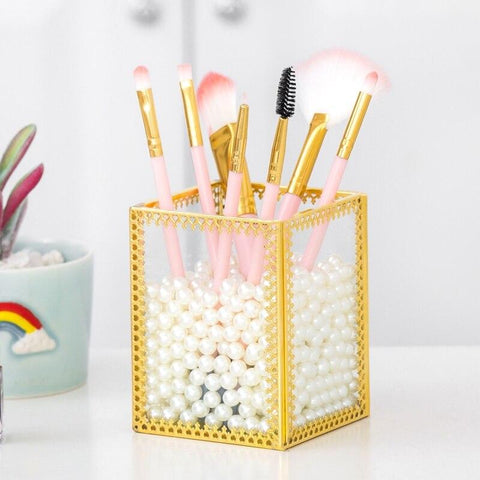 Transparent makeup storage organiser, which can be filled with decorative pearls to keep makeup accessories suspended.