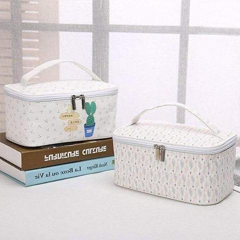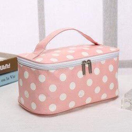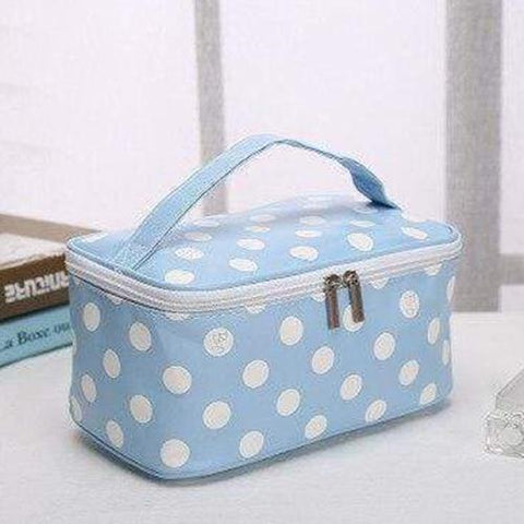 The Makeup Travel Case is available in five trendy colours: blue/white, pink/white and white with various designs. In addition to its sturdy handle, this case features a white two-way zip. Moreover, it contains a quite spacious compartment, which makes it easy to organise not only the makeup kit but also personal hygiene products such as perfumes, creams, lotions and others. The dimensions of this famous case are: 10 cm in width, 22 cm in length and 12 cm in height.