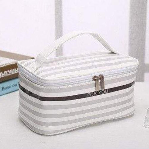 The Makeup Travel Case is easy to clean with soapy water and a cloth. This model features striped patterns, appealing designs and is decorated on the front with English inscriptions like "FOR YOU" and "HAPPY SMILE".