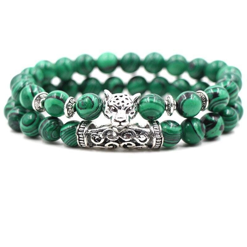 Acquire a rare and exotic charm with the malachite natural stone bracelet, adorned with a steel tiger. Malachite has been used for thousands of years as a protective talisman. It is also known as the healer's stone, as it helps combat fatigue and balance energy flow.