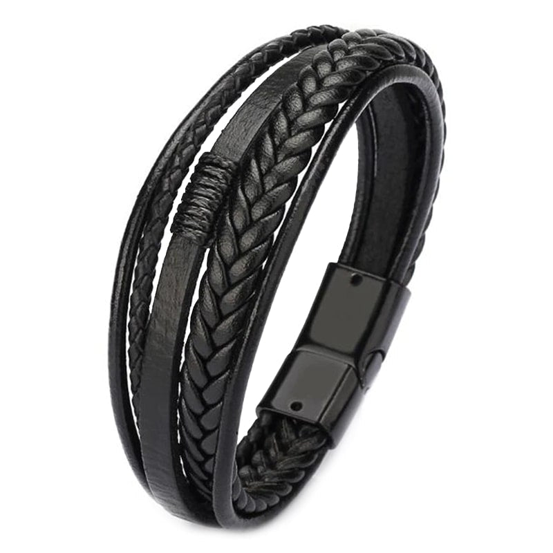 Solid and understated, sophisticatedly enhancing the appearance of its wearer, this men's black braided leather bracelet is the perfect fashion accessory for all men who appreciate the style of leather on their wrist. Our skilled artisans have worked this piece with high-quality genuine leather, masterfully braided, and in a timeless black tone, making it an elegant accessory for daily use over many years. Our men's black braided leather bracelets also include a black metallic clasp, which perfectly complements the rest of the bracelet's design, creating a harmonious and natural appearance.