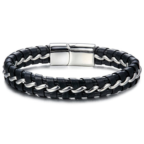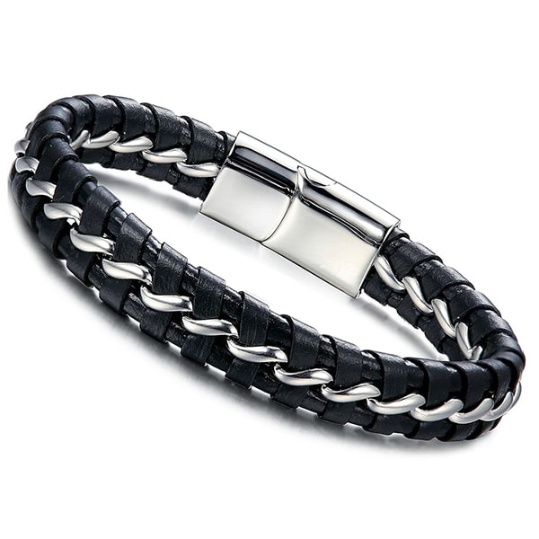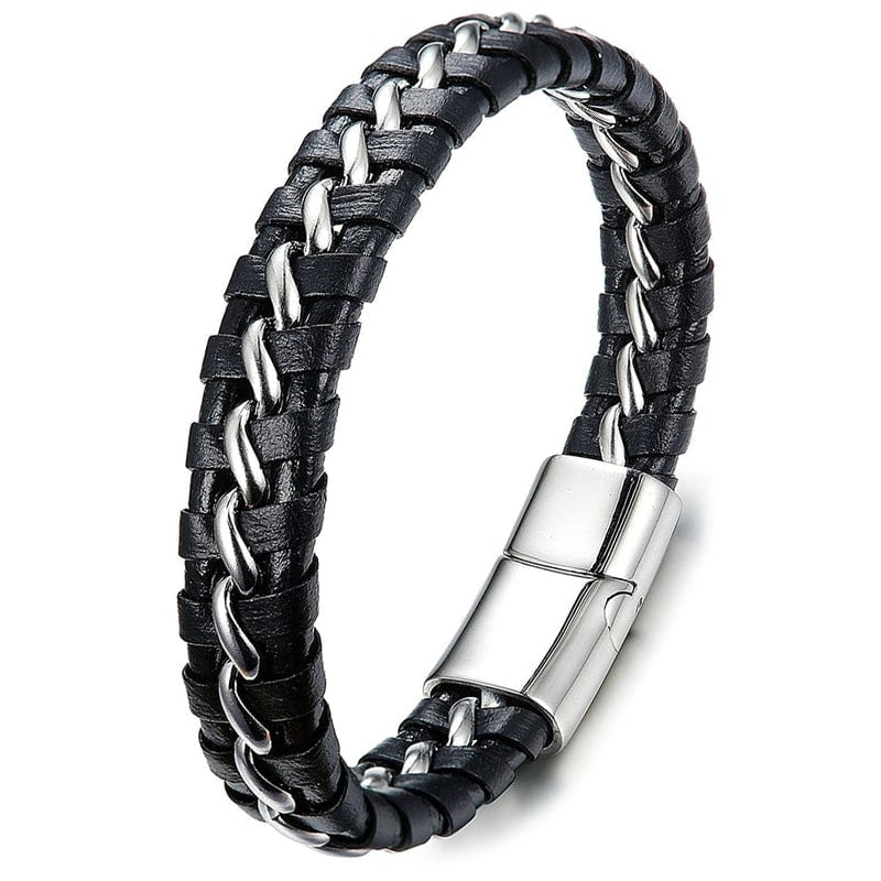 Our men's braided leather bracelet with a silver finish is a stunning fashion accessory that adds the perfect touch of style and elegance to your look, thanks to its sophisticated design that skillfully combines genuine leather with silver metal. Made from real leather and stainless steel, this leather bracelet meets all the requirements of an accessory that expresses your appreciation for fashion and the beauty of leather. The men's silver braided leather bracelet is easy to put on and take off thanks to the metal clasp, offers excellent stability on the wrist, and will certainly maintain its charm over the years.