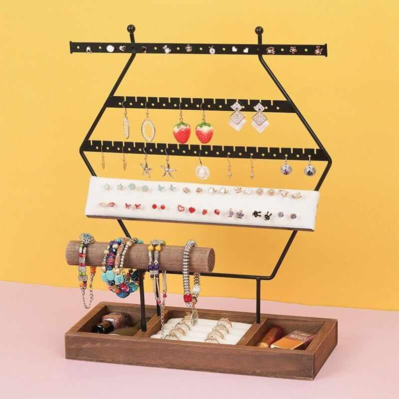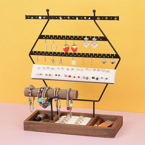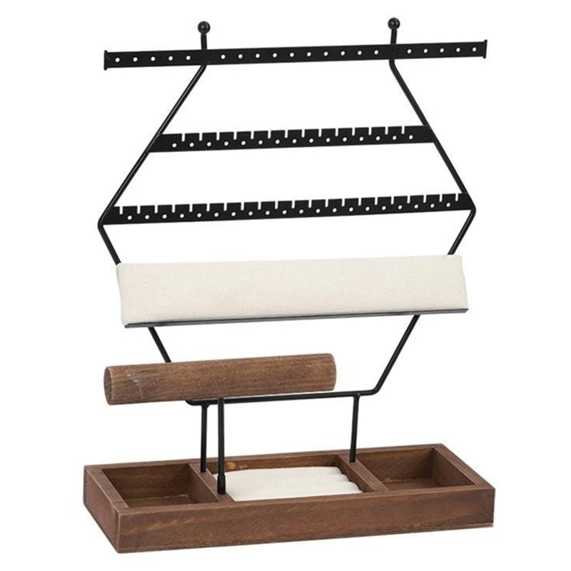 Have a lot of earrings and don't know how to organise them? With this large metal earring stand, you can hang both drop earrings and stud earrings, thanks to the included foam support. This jewellery organiser also includes a wooden stand for bracelets, two compartments for makeup and a ring holder.